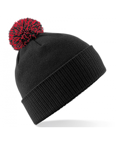 Tear-away Label für einfaches Neulabeln, Doppellagiger Strick, Zweifarbiger Pompon, Doppelfunktion - mit Umschlag als Mütze oder ohne Umschlag als Slouch-Beanie, Gerippter Umschlag