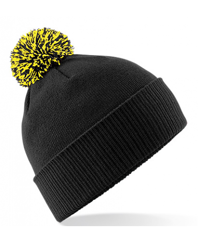 Tear-away Label für einfaches Neulabeln, Doppellagiger Strick, Zweifarbiger Pompon, Doppelfunktion - mit Umschlag als Mütze oder ohne Umschlag als Slouch-Beanie, Gerippter Umschlag