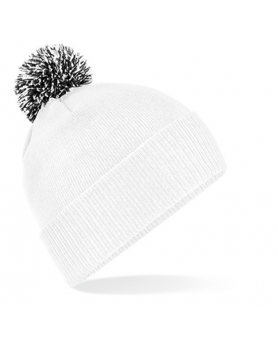 Tear-away Label für einfaches Neulabeln, Doppellagiger Strick, Zweifarbiger Pompon, Doppelfunktion - mit Umschlag als Mütze oder ohne Umschlag als Slouch-Beanie, Gerippter Umschlag