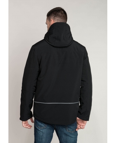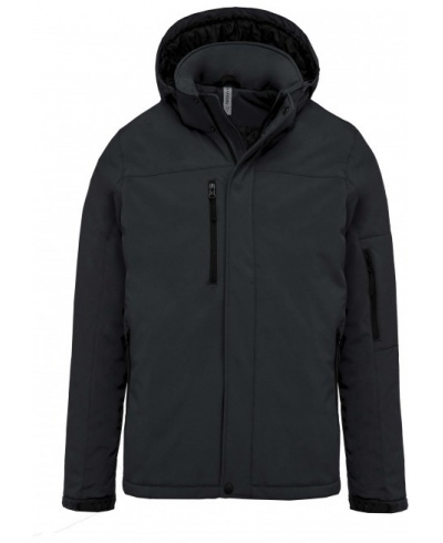 95 % Polyester / 5 % Elasthan. Dreilagiges Verbundgewebe atmungsaktiv 3.000 g/m²/24 h und wasserdicht 8.000 mm. Außenmaterial: 95 % Polyester / 5 % Elasthan. Atmungsaktive Mittelmembran. Innenschicht: Mikrofleece. Innenfutter gesteppt, 100 % Polyester. Vorderseite: 4 Reißverschlusstaschen (2 Seitentaschen, 1 am Ärmel, 1 an der rechten Brustseite). 2 Innentaschen mit Druckknopfverschluss. Abnehmbare Kapuze in 3-Bahnen-Design, gefüttert und gesteppt, Kordel mit Stoppern zum Zuziehen. Klettverschluss am Ärmel zur Weitenregulierung. 1 Reißverschluss an der Brusttasche links und 1 Reißverschluss am Saum zur Veredelung.