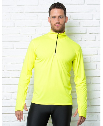 Side opening at end sleeve for thumb finger. Half Zip in contrast colour. Double stitch on collar, sleeves and bottom.