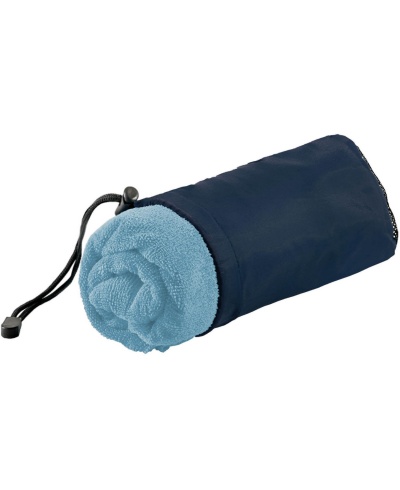 80% Polyester / 20% Polyamid. Ultra leicht und schnelltrocknend. Rundum gekettelt. Tasche mit kontrastfarbenem Reißverschluß. Faltbar in Polyamid-Beutel Ton-in-Ton (in Soft Blue: Beutel in Kontrastfarbe Navy) mit Kordelzug und Netzboden für optimale Luftzirkulation. Taschengröße: 25cm.