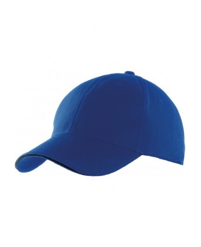 100% Polyester-Piqué. Sechs Felder. Lüftungsösen. Zwischenstück in Kontrastfarbe. Stirnband innen gepolstert für optimalen Tragekomfort. Verstellbarer Klettverschluß.
