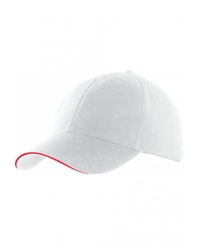 100% Polyester-Piqué. Sechs Felder. Lüftungsösen. Zwischenstück in Kontrastfarbe. Stirnband innen gepolstert für optimalen Tragekomfort. Verstellbarer Klettverschluß.