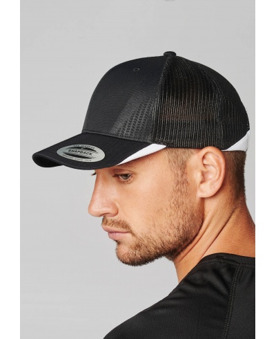 66 % Polyester / 30 % Polyamid / 4 % Baumwolle mit Polyamid-Netz. 6 Felder. Gebogener Schirm und Innenverstärkung an den vorderen Feldern für Formbeständigkeit. Flexfit® Cool & Dry Technologie für mehr Komfort und optimale Feuchtigkeitsaufnahme am elastischen Innenband. Kontrastfarbene Einsätze an Schirm und Netz. Kunststofflasche zur Größenverstellung.