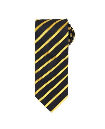 Eine klassische Sports Stripe Tie, getragen als traditionelles Teamwear-Team für diejenigen, die einen zusammenhängenden Look suchen. Schmale Streifen sind über die gesamte Länge der Krawatte eingewoben und sorgen für einen angenehmen Stil.