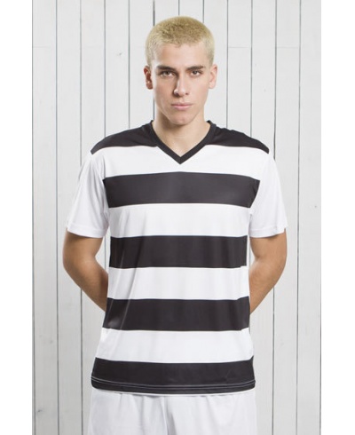 T-Shirt mit horizontalen Streifen für Kinder und Erwa- chsene. V-Ausschnitt.