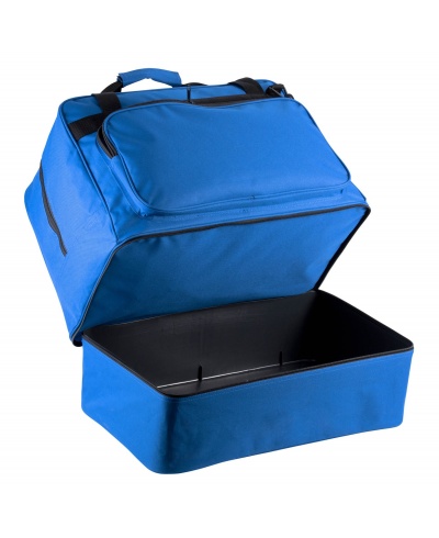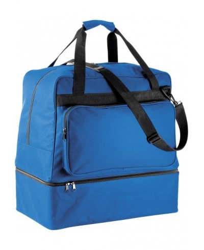 Sporttasche aus 600D Polyester mit doppelter PVC-Beschichtung, 90 Liter. Fester, abnehmbarer Boden aus PP mit Kunststoff-Standfüßen. Reißverschlusstasche vorne zur leichteren Veredelung, Kartenhalter, abnehmbarer Schulterriemen mit Silikonpolster. Fester Boden im Lieferumfang enthalten.