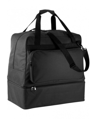 Sporttasche aus 600D Polyester mit doppelter PVC-Beschichtung, 90 Liter. Fester, abnehmbarer Boden aus PP mit Kunststoff-Standfüßen. Reißverschlusstasche vorne zur leichteren Veredelung, Kartenhalter, abnehmbarer Schulterriemen mit Silikonpolster. Fester Boden im Lieferumfang enthalten.