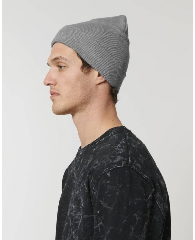 Material: 20 % recyceltes Polyester, 80 % organische ringgesponnene gekämmte Baumwolle; 1x1 Vollnadelrippe, vier Formnähte oben, faltbare Krempe, zweilagig; Zertfikate: STANDARD 100 by OEKO-TEX®; Peta - Approved VEGAN; Fair wear