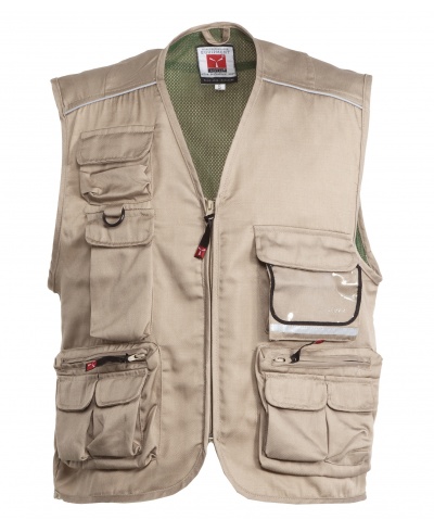 Summer vest, zip fastening, multi-front pocket system with reversible badge holder, reflex piping on the shoulders and back, roomy back hunting pocket. Contrasting colour dry-tech lining, open for easier printing and embroidery