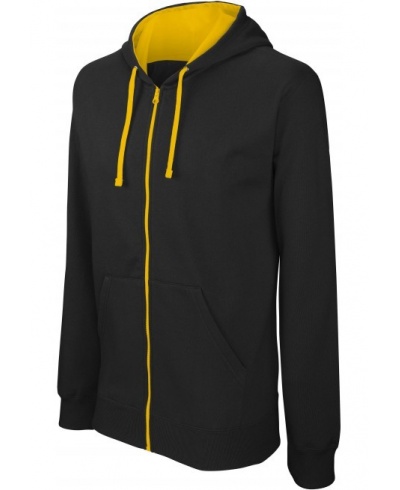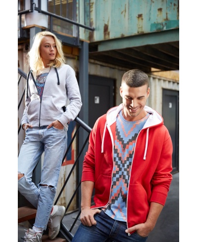 80% gekämmte Baumwolle / 20% Polyester. Gebürstetes Fleece. Kopfhörer-Kabelführung in der Kängurutasche und am Kragen. Strickbündchen an Ärmeln und Saum. Gefütterte Kapuze in Kontrastfarbe mit Kordelzug. YKK®-Reißverschluß in Kontrastfarbe