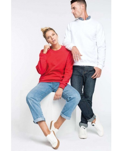 80 % Baumwolle / 20 % Polyester. Gebürstetes Fleece. Set-in-Ärmel. Schlauchware. Strickbündchen an Halsausschnitt, Ärmeln und Saum.