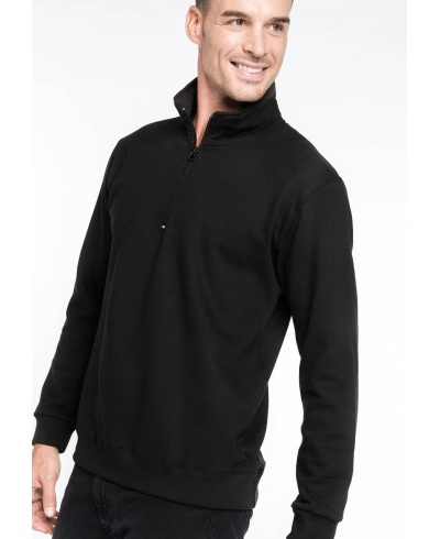 80 % Baumwolle / 20 % Polyester. Gebürstetes Fleece. Set-in-Ärmel. Schlauchware. Reißverschluss am Kragen und Nackenband. Saum und Ärmelbündchen in Rippstrick.