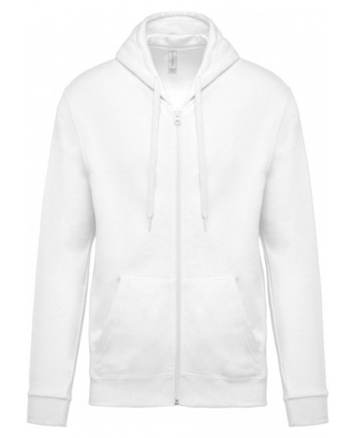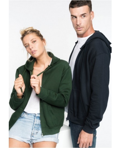 80 % Baumwolle / 20 % Polyester. Gebürstetes Fleece. Set-in-Ärmel. Schlauchware. Nylon-Reißverschluss. Gefütterte Kapuze mit Ton-in-Ton-Kordelzug. Kängurutaschen. Strickbündchen an Ärmeln und Saum.