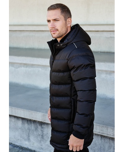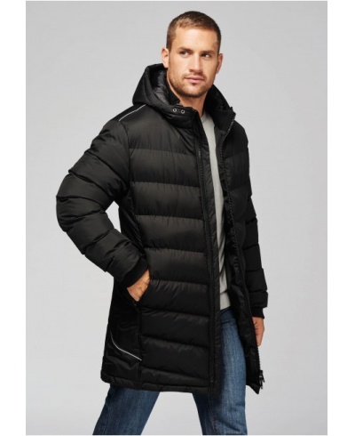 Außenstoff: 100 % Polyester 200 g/m² mit PVC-Beschichtung. Innenstoff: 100 % Polyester 350 g/m². Futterstoff: 100 % Polyester 60 g/m². 2 Reißverschluss-Seitentaschen. 1 Innentasche. Strickbündchen an Kragen und Ärmelsaum. Reflektierende Querstreifen an Schultern und Seiten. Gefütterte Kapuze. 1 Reißverschluss an der Brusttasche und 1 Reißverschluss am Saum zur Veredelung.