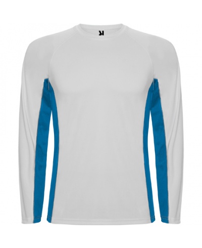 Langärmeliges Funktions-T-Shirt. Kombiniert mit zwei Polyestergewebe. Raglanärmel. Rundhals mit Nackenband. Microperforiertes Gewebe am Seitenteil und Armloch. Bequem und leicht anpassbar.