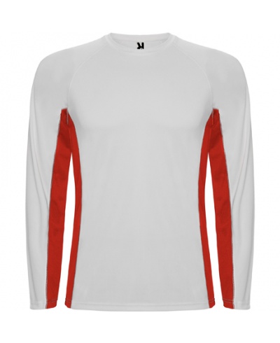 Langärmeliges Funktions-T-Shirt. Kombiniert mit zwei Polyestergewebe. Raglanärmel. Rundhals mit Nackenband. Microperforiertes Gewebe am Seitenteil und Armloch. Bequem und leicht anpassbar.