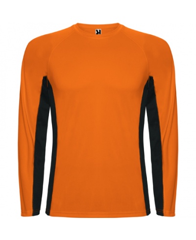Langärmeliges Funktions-T-Shirt. Kombiniert mit zwei Polyestergewebe. Raglanärmel. Rundhals mit Nackenband. Microperforiertes Gewebe am Seitenteil und Armloch. Bequem und leicht anpassbar.