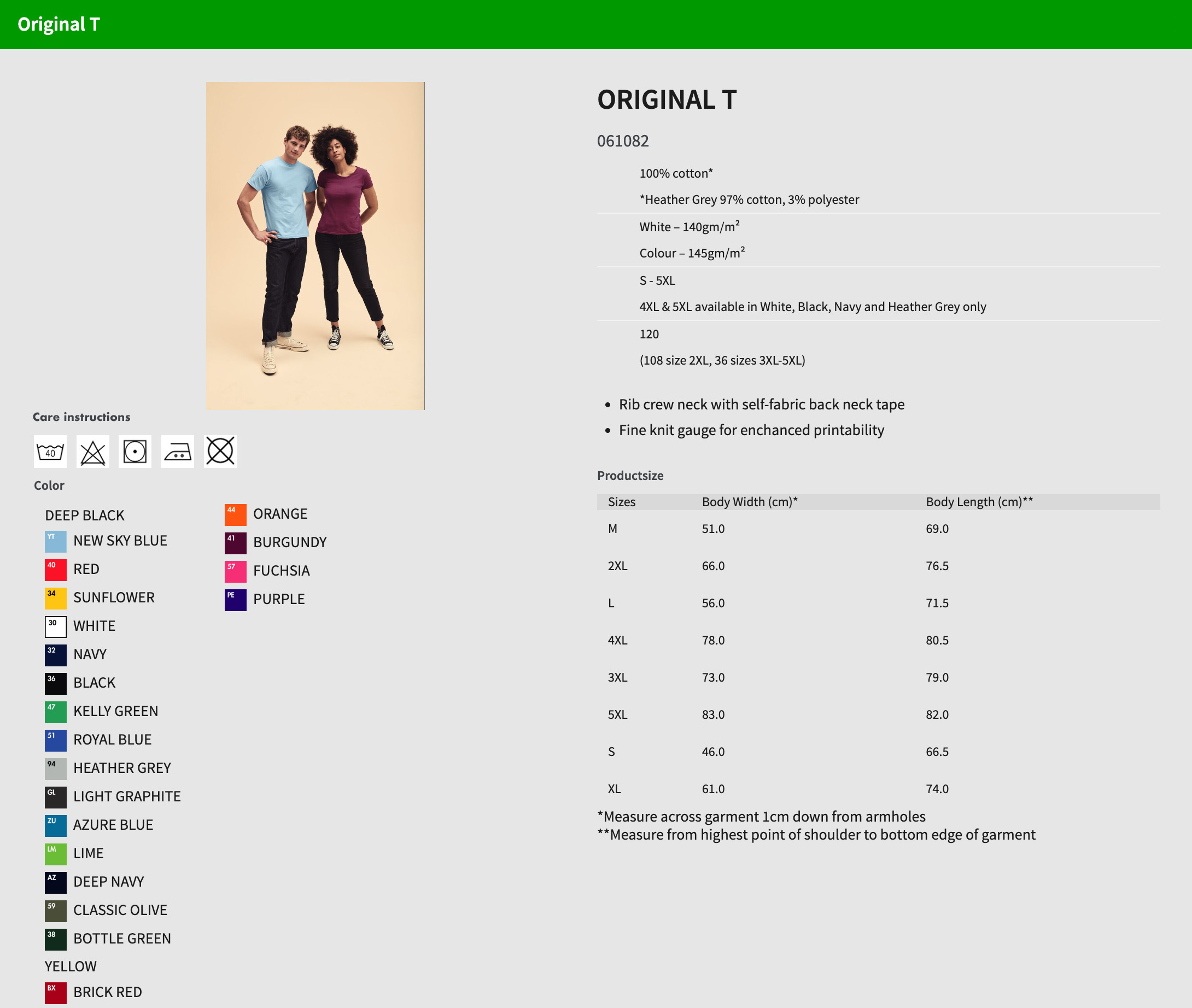| material: | 100% cotton; Heather Grey 97% cotton, 3% polyester |