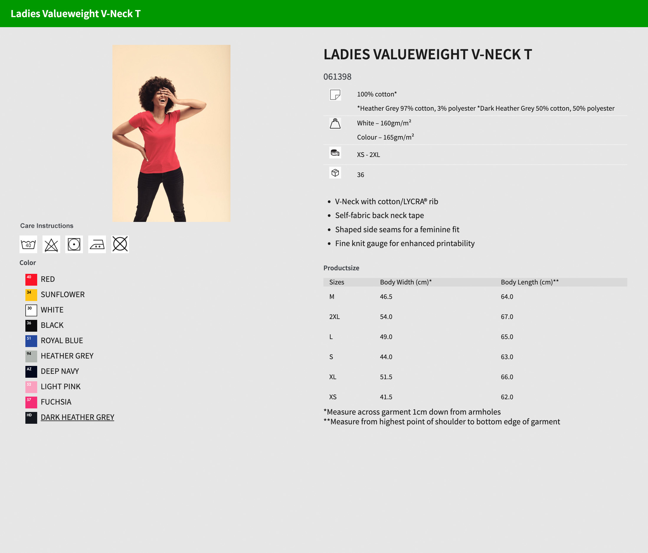 Material: 100% Baumwolle; Heather Grey 97 % Baumwolle, 3 % Polyester; Dark Heather Grey 50 % Baumwolle, 50 % Polyester; Gewicht: Weiß - 160g/m²; Farbe - 165g/m²; V-Ausschnitt mit Baumwolle / LYCRA®-Ripp, Nackenband aus dem gleichen Stoff, geformte Seitennähte für eine feminine Passform, feine Strickstärke für bessere Bedruckbarkeit, Abreißetikett, femininer Fashion-Fit-Schnitt, erhältlich in Herren und Damen; Zertifikate: STANDARD 100 by OEKO-TEX®; WRAP