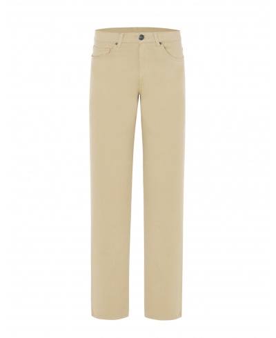 Bundverschluss mit Knopf, fünf Gürtelschlaufen, Reißverschluss und Nieten in Messingfarbe.