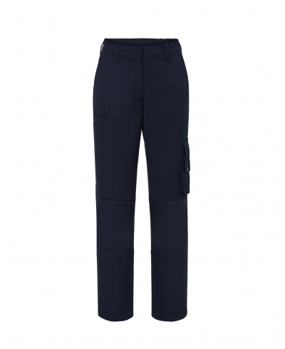 Ein Riemen aus gleichem Stoff vom unteren Teil der linken Gesäßtasche bis zur Seitennaht.