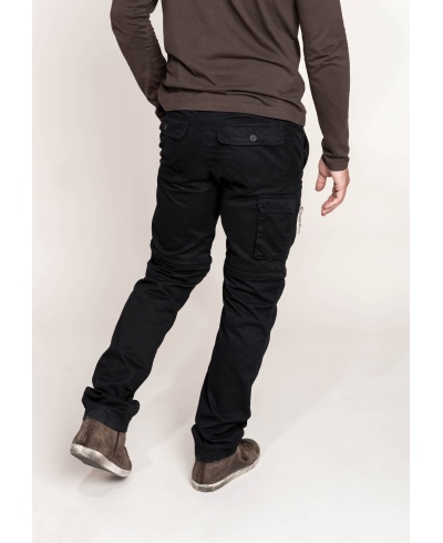 100% Baumwoll-Twill, mit Enzymen vorgewaschen. YKK ®-Reißverschluß mit Druckknopf. 4 Taschen vorne und 3 hinten. Wadenbein abtrennbar per Reißverschluß. Kunststoffring, um einen Karabinerhaken (nicht mitgeliefert) am Gürtel zu befestigen.
