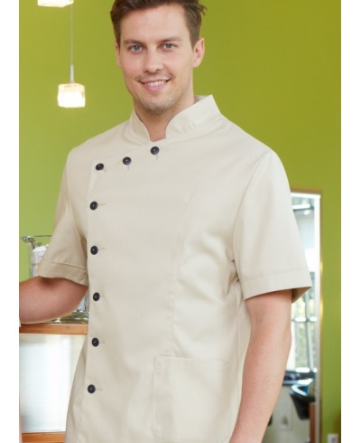 Taillierte Tunika mit Kurzarm und Stehkragen. Besonders schön ist das schräg geschnittene Revers, das mit Knöpfen geschlossen wird. Die Tunika hat seitliche Schlitze und eine Rückenfalte für mehr Bewegungsfreiheit. Das hochwertige Stretchgewebe ist sehr bequem und leicht zu pflegen. Selbst bei Waschtemperaturen von 95° C bleiben Form, Farbe und Tragekomfort voll erhalten.