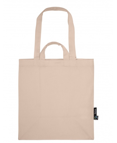 Material: 100% Bio-Fairtrade-Baumwolle, köperbindung; Gewicht: 210 g/m²; Schwere Köperbindung. Lange und kurze Griffe (60 cm; 24cm). Boden- und Seitenzwickel. An Spannungspunkten verstärkt. Größen: 35 x 38 cm; Neutral® & Fairtrade Flaglabels an der Seite