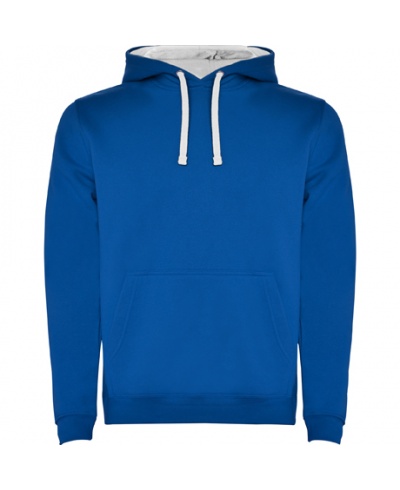 Kapuzensweat. Kapuzenfutter, Kordelzug und Metalösen in Kontrastfarben, Kindergrößen ohne. Nackenband mit Fischgrätmuster. Kängurutasche. 1x1 Rippstrick und Elasthan an Ärmelbündchen und Saum.