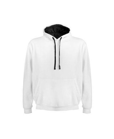 Kapuzensweat. Kapuzenfutter, Kordelzug und Metalösen in Kontrastfarben, Kindergrößen ohne. Nackenband mit Fischgrätmuster. Kängurutasche. 1x1 Rippstrick und Elasthan an Ärmelbündchen und Saum.