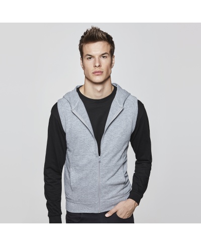 Kapuzenweste mit durchgehendem Reißverschluss. Eingefasste, weite Ärmelöffnungen. Seitlicher Stoffeinsatz mit Ziernaht. Breites Rippenbündchen am Saum. Kängurutaschen.