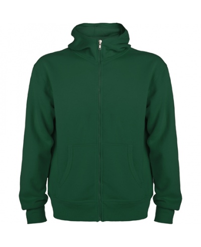 Kapuzen Sweatjacke. Durchgehender Reißverschluss. Rippstrick an Kapuze und Eingriffen der Kängurutaschen. 2x2 Rippstrickbündchen mit Elasthan bei Ärmelbündchen und Saum.