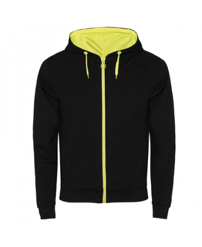 Sweat-Jacke mit fluoreszierenden Teilen. Durchgehender Reissverschluss mit fluoreszierenden Puller. Kaputze mit Innenseite aus Mikrolochgewebe, Kordelzug und Metallösen in fluoreszierende Farbe. 1x1 Rippstrick am Ärmelbündchen und Saum. Zwei Vordertaschen. Verstärkter Nackenband.