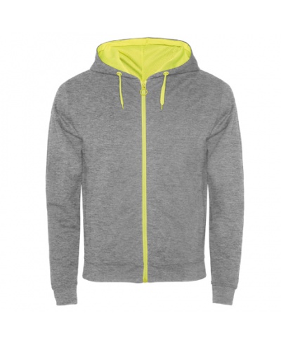 Sweat-Jacke mit fluoreszierenden Teilen. Durchgehender Reissverschluss mit fluoreszierenden Puller. Kaputze mit Innenseite aus Mikrolochgewebe, Kordelzug und Metallösen in fluoreszierende Farbe. 1x1 Rippstrick am Ärmelbündchen und Saum. Zwei Vordertaschen. Verstärkter Nackenband.