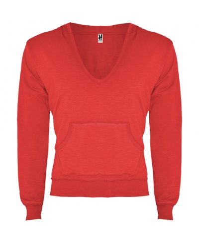 Kapuzensweatshirt mit weitem V-Ausschnitt. Eingefasster Kragen im gleichen Stoff. Kängurutasche, 1 x 1 Rippenbündchen an Ärmeln und Saum, "Used Look" mit offenen Rollsaumkanten.