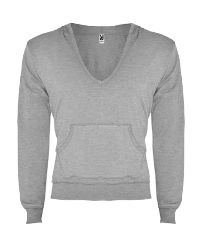 Kapuzensweatshirt mit weitem V-Ausschnitt. Eingefasster Kragen im gleichen Stoff. Kängurutasche, 1 x 1 Rippenbündchen an Ärmeln und Saum, "Used Look" mit offenen Rollsaumkanten.