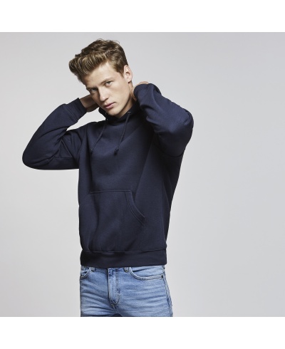 Kapuzensweat. Kordelzug und Metalösen, Kindergrößen ohne. Kängurutasche. 1x1 Rippstrick und Elasthan bei Ärmelbündchen und Saum.