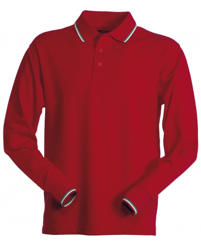 Unisex langärmeliges Poloshirt mit 3 passenden Knöpfen, Kragen- und Ärmelbesatz (Farben der Flagge), Rippkragen und -bündchen, Seitenschlitze, verdeckte Kragensteppung, Seitenverstärkungsband, Nackenband innen