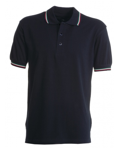 Unisex Kurzarm-Poloshirt mit 3 weißen Knöpfen, farblich abgesetztem Kragen und Ärmelabschluss (Farben der Fahne), Rippkragen und Ärmelabschluss, Seitennähte mit verstärkten Nähten, verdeckte Kragensteppung, Seitenverstärkungsband, Stretchnähte, Nackenband innen