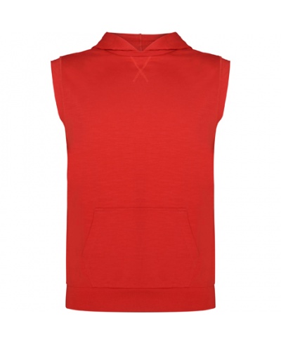 Ärmelloses Kapuzen-Sweatshirt, mit breit geripptem Halsausschnitt, Armausschnitt und Kängurutasche im "Used Look Style" mit offenen Rollsaumkanten. Gekreuzte Ziernähte mittig am Kragen.