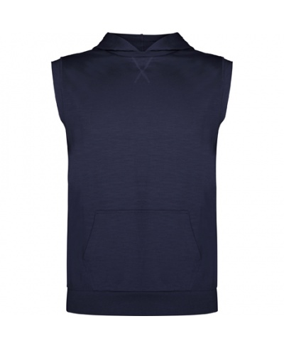 Ärmelloses Kapuzen-Sweatshirt, mit breit geripptem Halsausschnitt, Armausschnitt und Kängurutasche im "Used Look Style" mit offenen Rollsaumkanten. Gekreuzte Ziernähte mittig am Kragen.