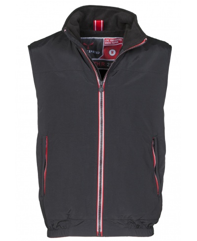 Unisex-Weste mit Reißverschluss in Kontrastfarbe, elastischem Bund, zwei Außentaschen mit verdecktem Reißverschluss; Innenseite: wattiert, Mikrofleece im Kragen und in der Rückenpartie, eine Reißverschlusstasche mit Öffnungen für Kopfhörer und Smartphonekabel, Reißverschluss in Brusthöhe und unten zum einfacheren Veredeln mit Druck und Stick