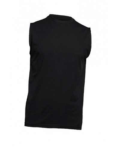 Single Jersey. Double stitch on collar, armhole and bottom.