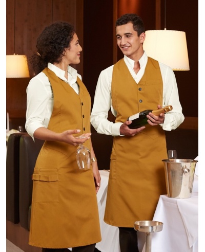 Eine gelungene Mischung aus elegant und praktisch repräsentiert diese Westenschürze. Durch ihren raffinierten Schnitt passt die Schürze mit nur einer Größe allen Mitarbeitern im Team. Das Oberteil hat vier Zierknöpfe, das Nackenband ist mit drei Knöpfen in der Länge verstellbar. In der Taille wird die Schürze mit Schürzenbändern geschlossen. Eine seitlich aufgesetzte Tasche (17x19 cm) mit zwei Fächern bietet genug Stauraum für Arbeitsmaterial. Der besondere Clou sind die aufgesetzten Schlaufen, in denen griffbereit das Serviertuch eingehängt werden kann. 95ºC waschbar, knitterarm, pflegeleicht, farbecht, industriewäsche- und finishertauglich.