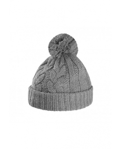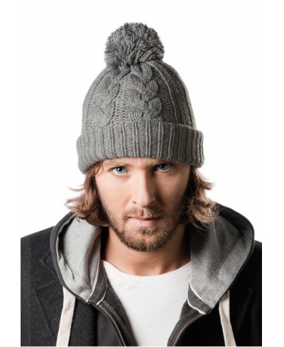 100% Acryl außen / 100% Polyester innen. Gestrickte Bommelmütze, Mikrofleece gefüttert.