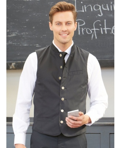 Die figurbetonte Weste erhält ihre schöne Passform durch Teilungsnähte hinten und vorne. Mit abgestepptem Stehkragen, drei Paspeltaschen und kleinen Seitenschlitzen. Die Weite kann durch ein Zugband im Rücken reguliert werden. Die Herrenweste ist vorne abgerundet. Standardmäßig ist die Weste mit abnehmbaren, schwarzen Knöpfen ausgestattet. Austauschknöpfe in matt silber sind separat erhältlich. 95° C waschbar, pflegeleicht, farbecht, industriewäsche- und finishertauglich.