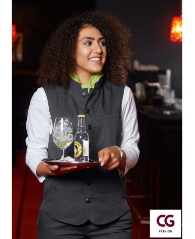 Die figurbetonte Weste erhält ihre schöne Passform durch Teilungsnähte hinten und vorne. Mit abgestepptem Stehkragen, drei Paspeltaschen und kleinen Seitenschlitzen. Die Weite kann durch ein Zugband im Rücken reguliert werden. Die Damenweste läuft vorne leicht spitz zu. Standardmäßig ist die Weste mit abnehmbaren, schwarzen Knöpfen ausgestattet. Austauschknöpfe in matt silber sind separat erhältlich. 95° C waschbar, pflegeleicht, farbecht, industriewäsche- und finishertauglich.