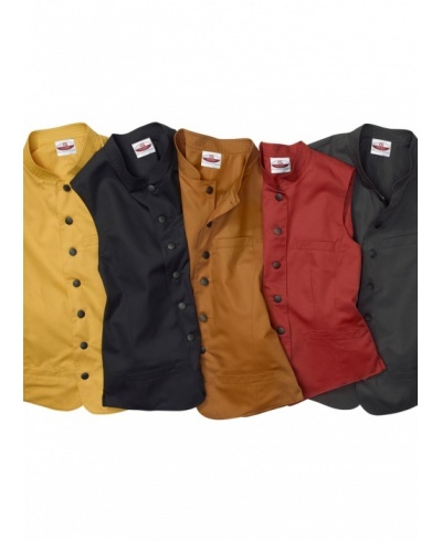 Die figurbetonte Weste erhält ihre schöne Passform durch Teilungsnähte hinten und vorne. Mit abgestepptem Stehkragen, drei Paspeltaschen und kleinen Seitenschlitzen. Die Weite kann durch ein Zugband im Rücken reguliert werden. Die Damenweste läuft vorne leicht spitz zu. Standardmäßig ist die Weste mit abnehmbaren, schwarzen Knöpfen ausgestattet. Austauschknöpfe in matt silber sind separat erhältlich. 95° C waschbar, pflegeleicht, farbecht, industriewäsche- und finishertauglich.